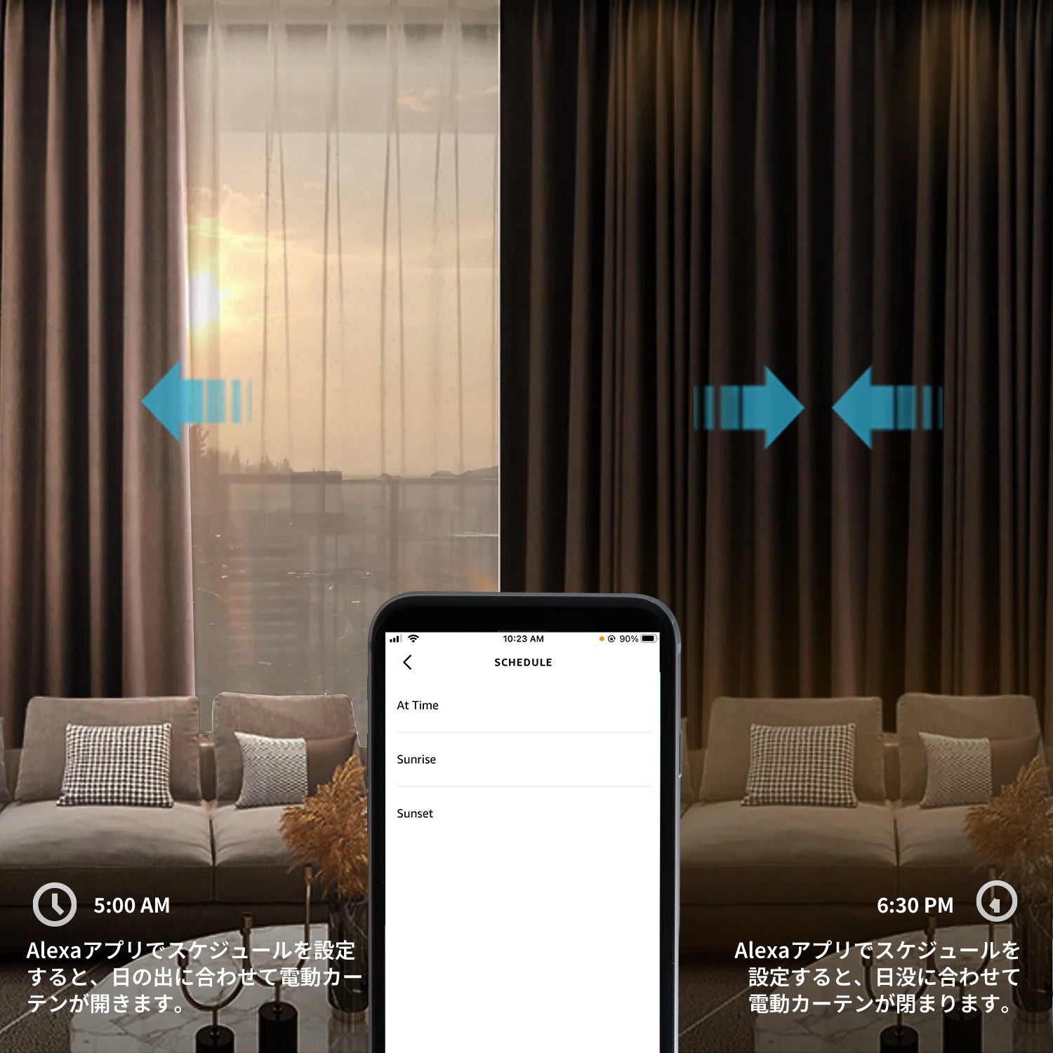 スマートデバイスやハブを利用すれば、外出中でも事前に設定した通りに自宅を保つことができます。当社の多機能なモーターは、Apple HomeKit、Amazon Alexa、Samsung SmartThings、Google Assistantなど、多数のアプリと連携可能で、お好みのプラットフォームを通じてシェードを自由にコントロールできます。