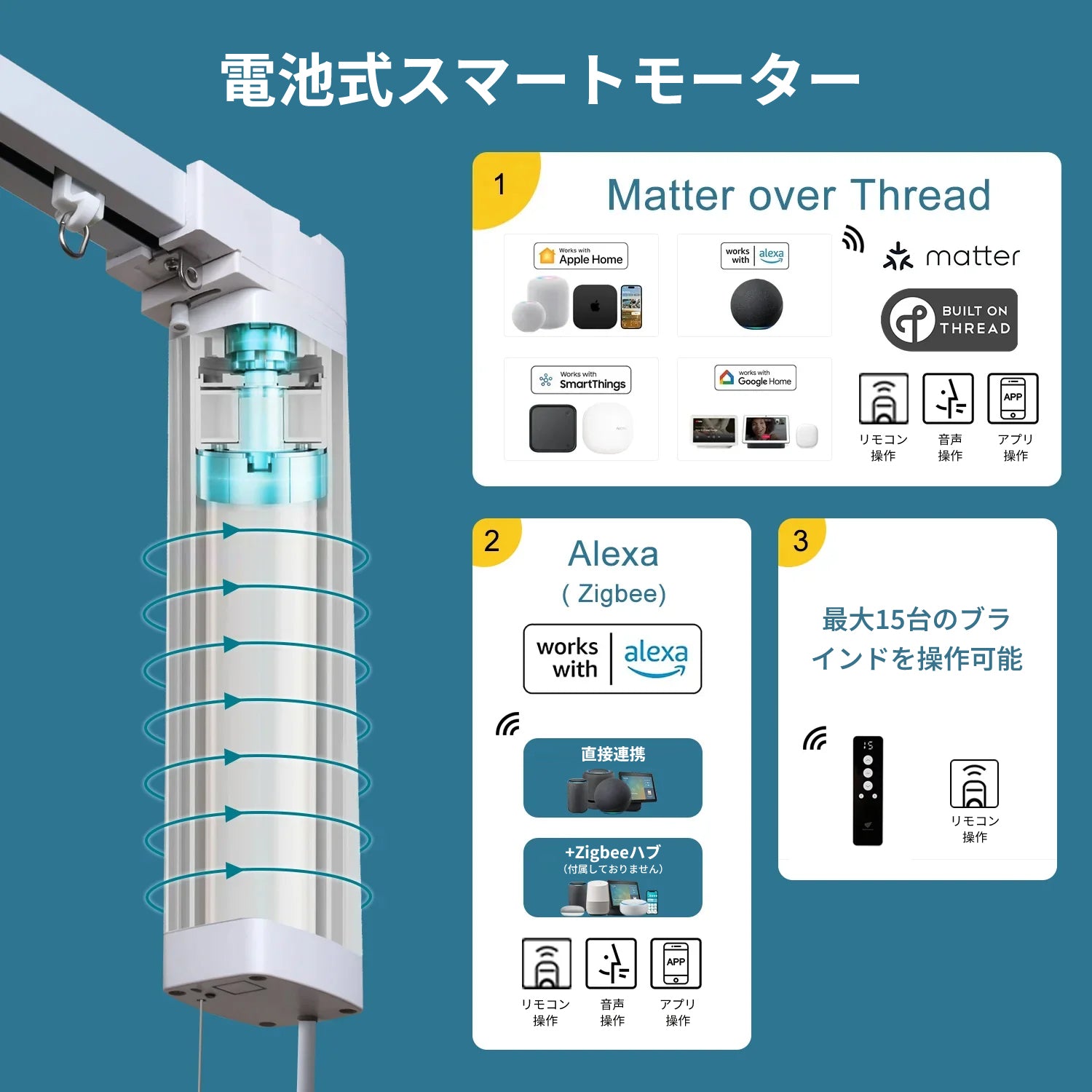 このモーターはSamsung SmartThings、Home Assistant、HubitatなどのZigbee 3.0対応ハブと互換性があります。また、Alexaデバイスの7機種(Echo Plus 第2世代、Echo Show 第2世代、Echo Studio、Echo Show 10、Echo 第4世代、Echo Show 8(第3世代)、New Echo Wall Hub)を通じてAmazon Alexaに直接接続可能です。SmartThingsアプリからどこでもブラインドを操作できます。さらに、Google HomeやAmazon Alexaと連携して音声操作も実現します。